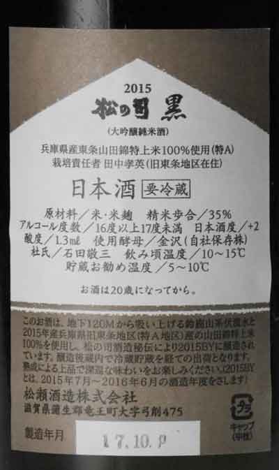『松の司』通常商品のフラッグシップである“黒”。酒米栽培の特A地区である兵庫県産東条山田錦を35%まで精米し、酵母は熊本酵母主体のものを使用。