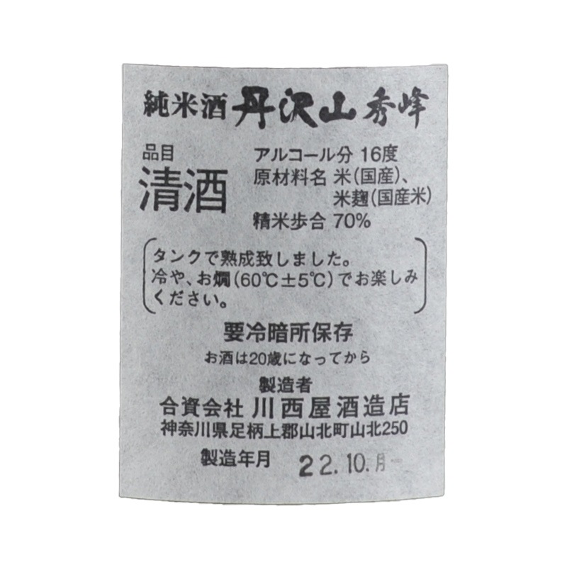 丹沢山 秀峰 2回火入れ 純米 1800ml 川西屋酒造店