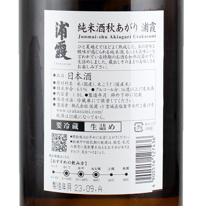 浦霞 純米酒 秋あがり 1800ml 佐浦