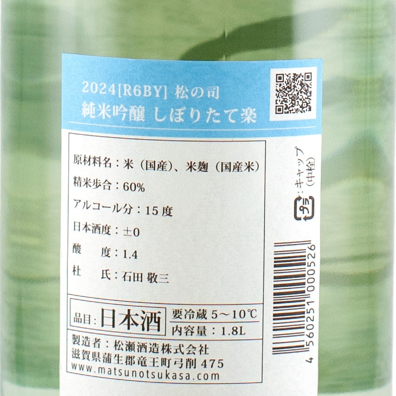 松の司 楽 しぼりたて 純米吟醸 生酒 1800ml 松瀬酒造