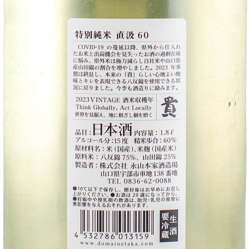 貴 特別純米 生原酒 直汲み 1800ml 永山本家酒造