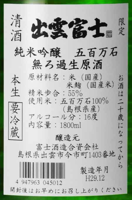 出雲富士 五百万石 純米吟醸 無ろ過生原酒 1800ml 富士酒造