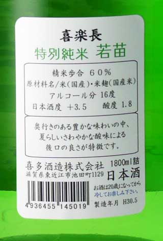 喜楽長 特別純米 若苗 1800ml 喜多酒造