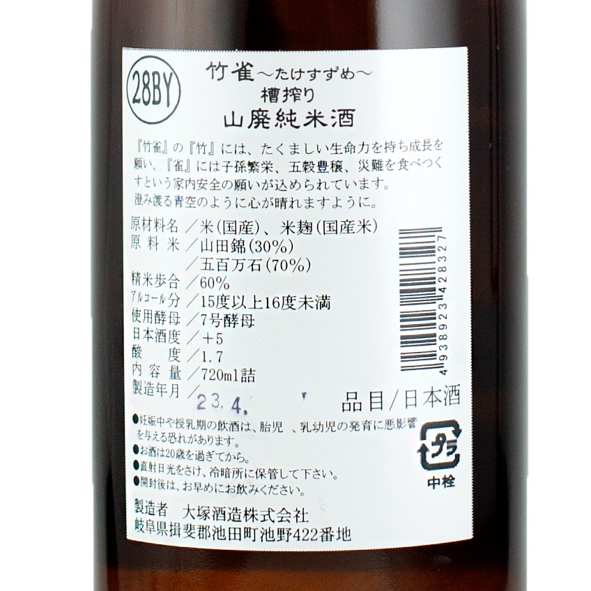 竹雀 山廃純米酒 720ml 大塚酒造