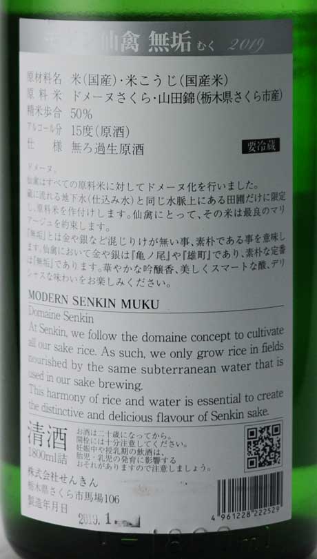 栃木県さくら市のテロワールを大切にするという発想から蔵をドメーヌ化、仕込み水と同じ水で育てた米にこだわり、蔵の地下水と同じ水脈上に限定して作付けしています。また、「原点回帰」を追及し、古代米「亀の尾」の栽培や低精白、生もと造り、木桶仕込みといった手法でコンセプトを表現しています。ラインナップは、定番のモダン仙禽(速醸)とクラシック仙禽(生もと)、完全無添加のナチュールシリーズ、プレミアムシリーズの4ブランドに分けられ、全体として甘みと酸味を基調とした味わいに仕上がっています。