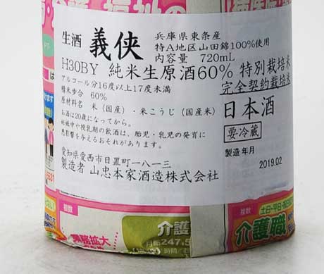 1789年~1801年(寛政年間)江戸時代中期の創業した、愛知県愛西市にある蔵元です。義侠という酒銘の由来は、明治時代に小売商と年間契約を結んでいたが、原料が高騰したことで同価格では採算が合わないにも関わらず、約束を守ったことからきています。蔵の社長は代々「山田忠右エ門」を名乗り、現当主で11代目。義侠のお酒は米の良さ、造りの良さがそのまま反映され、酒本来の持っている色を残し、香りを求めず、芯のあるどっしりとした旨味、しっかりした酸がみごとに調和した奥深い味わいで多くの酒ファンを魅了している。