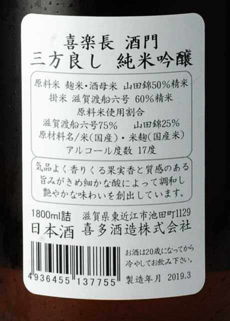 喜楽長 三方良し 純米吟醸 火入れ 1800ml 喜多酒造