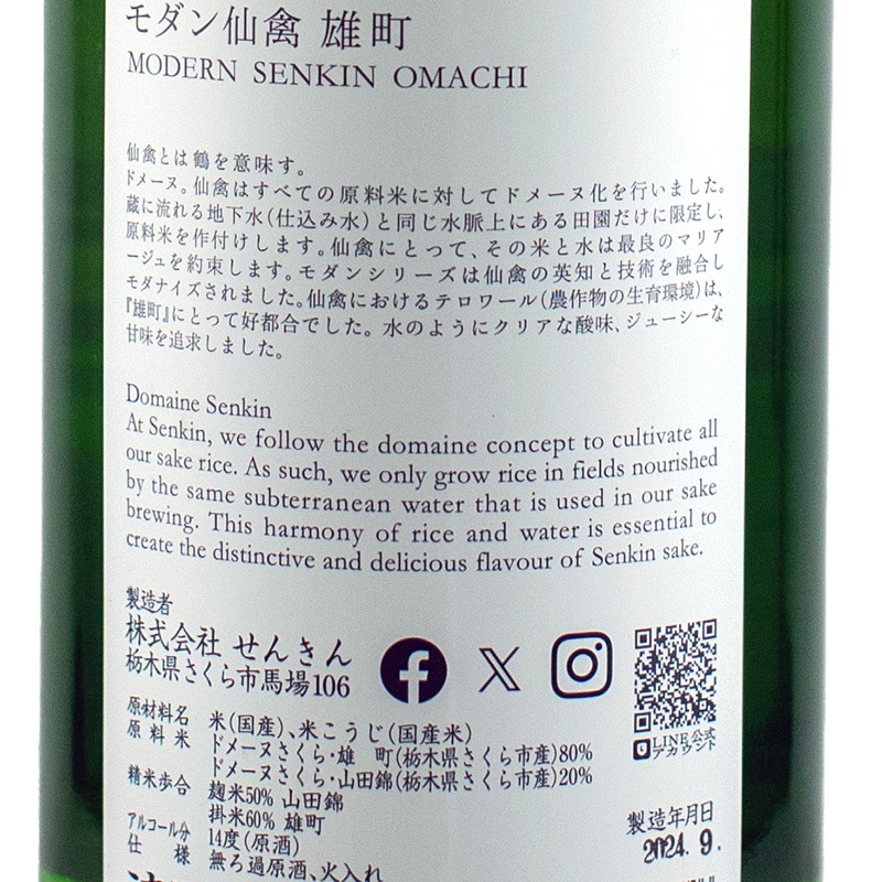 栃木県さくら市のテロワールを大切にするという発想から蔵をドメーヌ化、仕込み水と同じ水で育てた米にこだわり、蔵の地下水と同じ水脈上に限定して作付けしています。また、「原点回帰」を追及し、古代米「亀の尾」の栽培や低精白、生もと造り、木桶仕込みといった手法でコンセプトを表現しています。ラインナップは、定番のモダン仙禽(速醸)とクラシック仙禽(生もと)、完全無添加のナチュールシリーズ、プレミアムシリーズの4ブランドに分けられ、全体として甘みと酸味を基調とした味わいに仕上がっています。