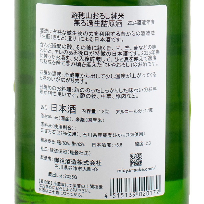 遊穂 山おろし純米 ひやおろし 1800ml 御祖酒造