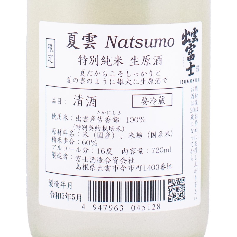 出雲富士 夏雲(なつも) 特別純米生原酒 佐香錦 720ml 富士酒造