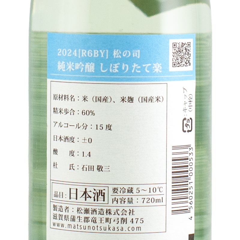 松の司 楽 しぼりたて 純米吟醸 生酒 720ml 松瀬酒造