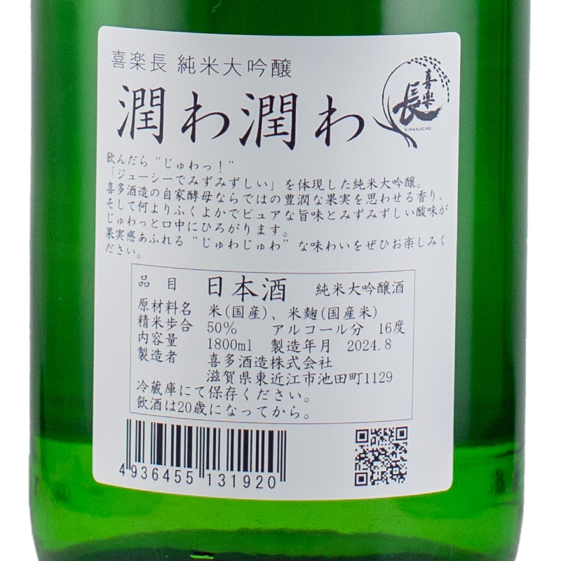 喜楽長 純米大吟醸 潤わ潤わ(じゅわじゅわ) 1800ml 喜多酒造