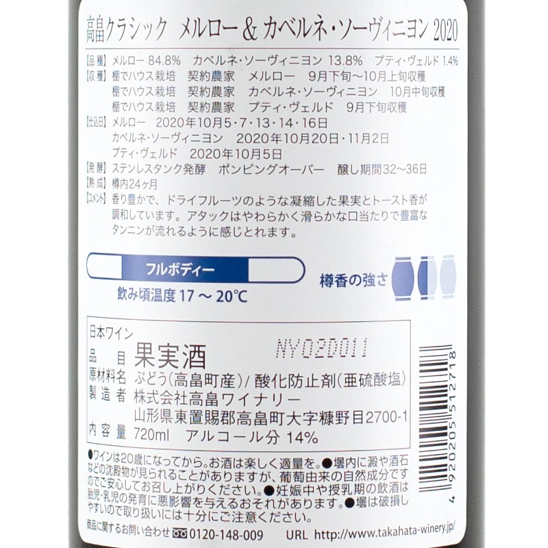 高畠クラシック メルロー&カベルネ・ソーヴィニヨン 2020 720ml 高畠ワイナリー