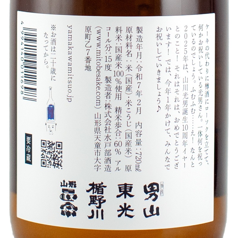 ラベルには、ケーキの代わりに樽酒にローソクを立て、山川光男誕生10周年をお祝いしている光男さん。