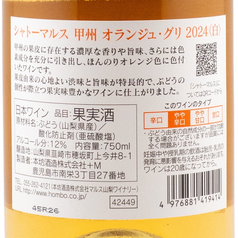 シャトーマルス 甲州 オランジュ・グリ 2024 本坊酒造 750ml