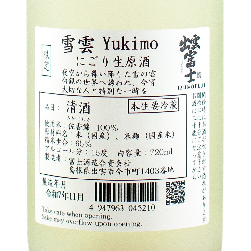 出雲富士 雪雲-YUKIMO にごり生原酒 佐香錦 720ml 富士酒造